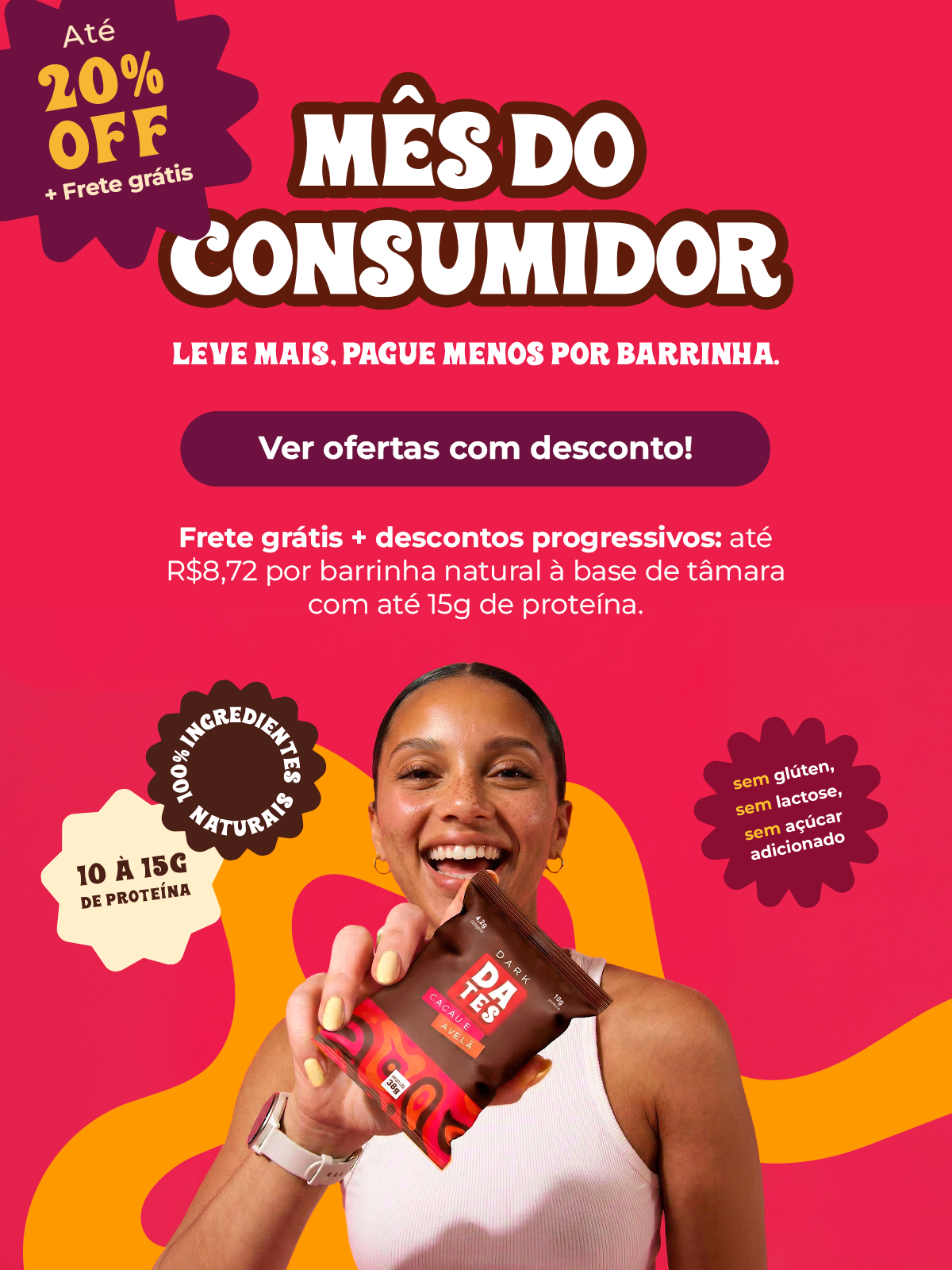 Cada display dos nossos snacks contém 12 unidades. Eles são embalados individualmente, perfeitos para você levar na bolsa, na lancheira ou ter sempre à mão quando bater aquela vontade de um lanche gostoso e saudável.